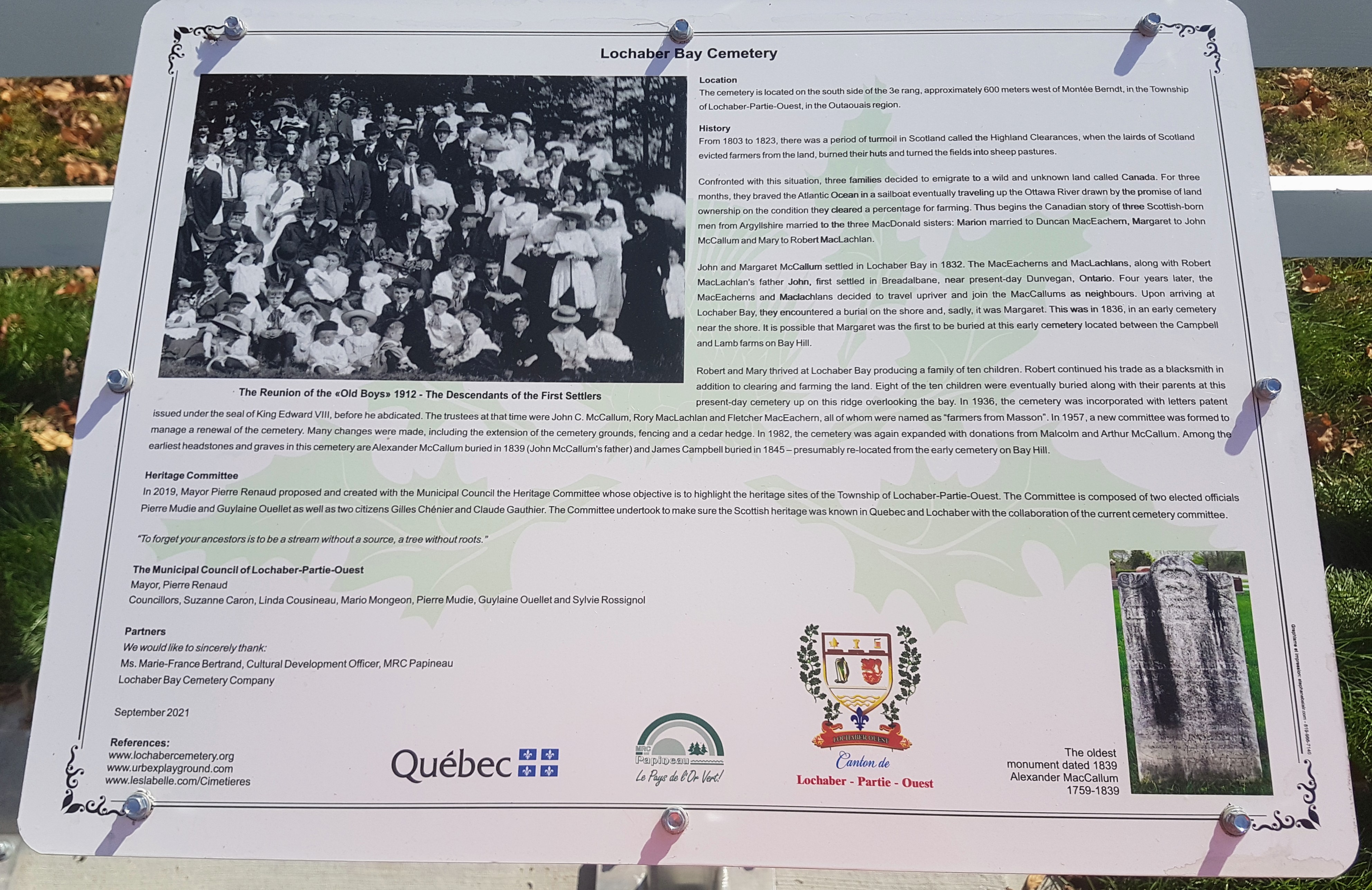 Yes, the Municipality of Lochaber-Partie-Ouest has discovered us - which is fine - and they installed a pair of information plaques at the entrance to the cemetery after extensive consultation with us. We are very pleased with the result and I think you will be too!