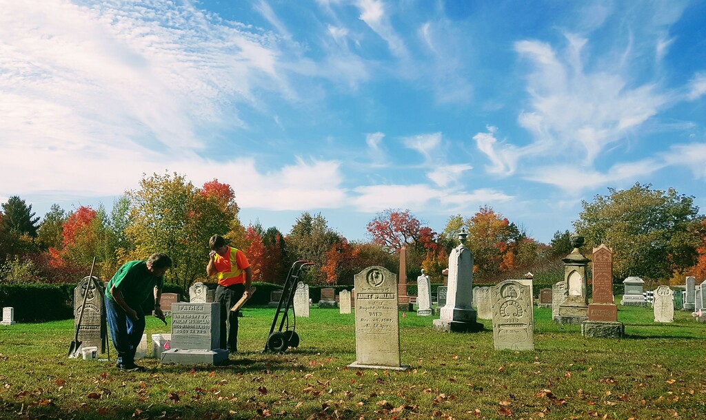 This summer we engaged Yolkowski Monuments to work on our project list. Unfortunately the headstone and monuments business has been affected by the pandemic and the demands for new headstones has pushed maintenance projects like ours to a lower priority. That said, Yolkowski managed to spend a day at our cemetery and Donnie and Jimmy worked hard and accomplished quite a bit.