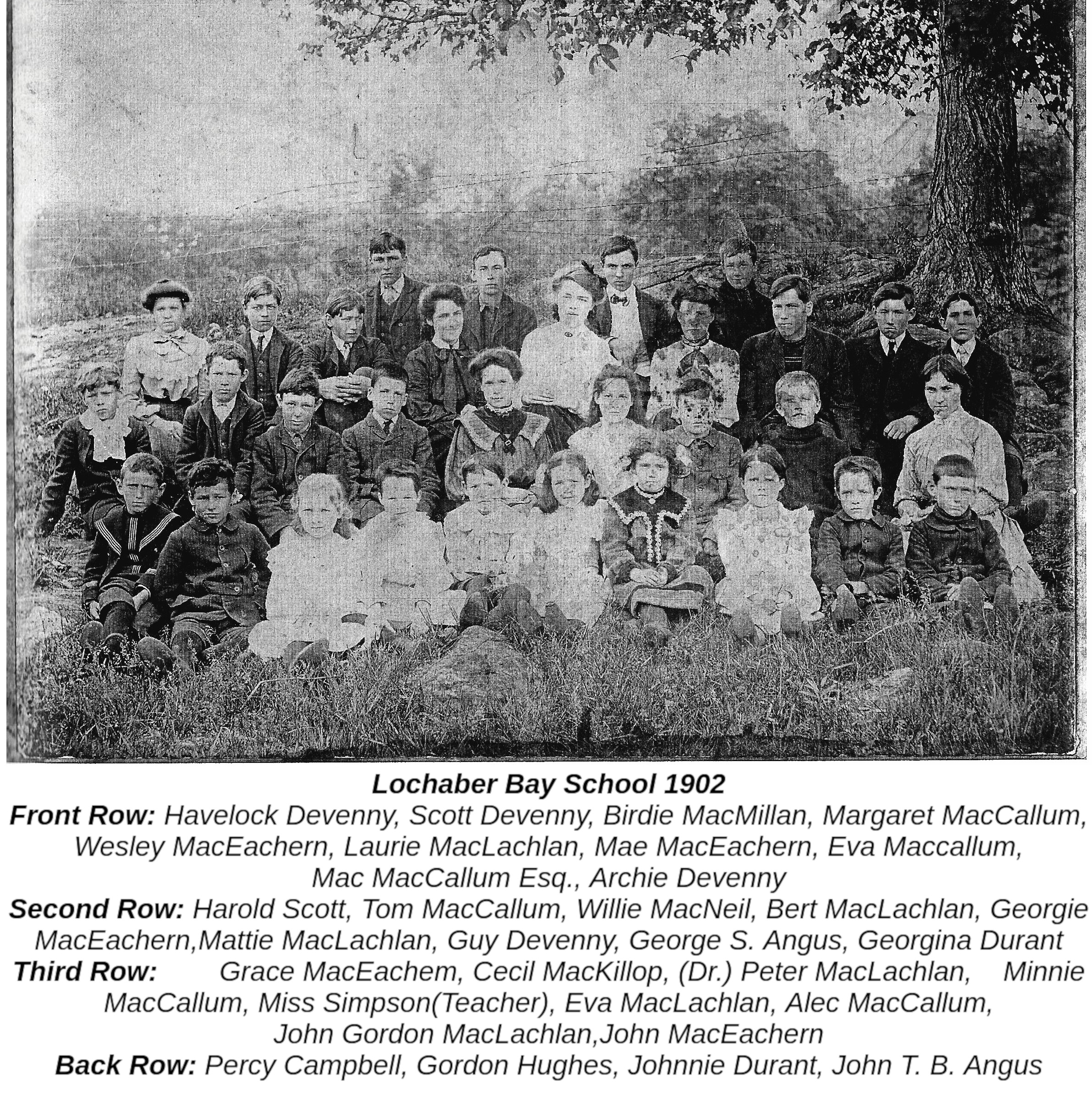 Lochaber Bay School 1902 Front Row: Havelock Devenny, Scott Devenny, Birdie MacMillan, Margaret MacCallum,